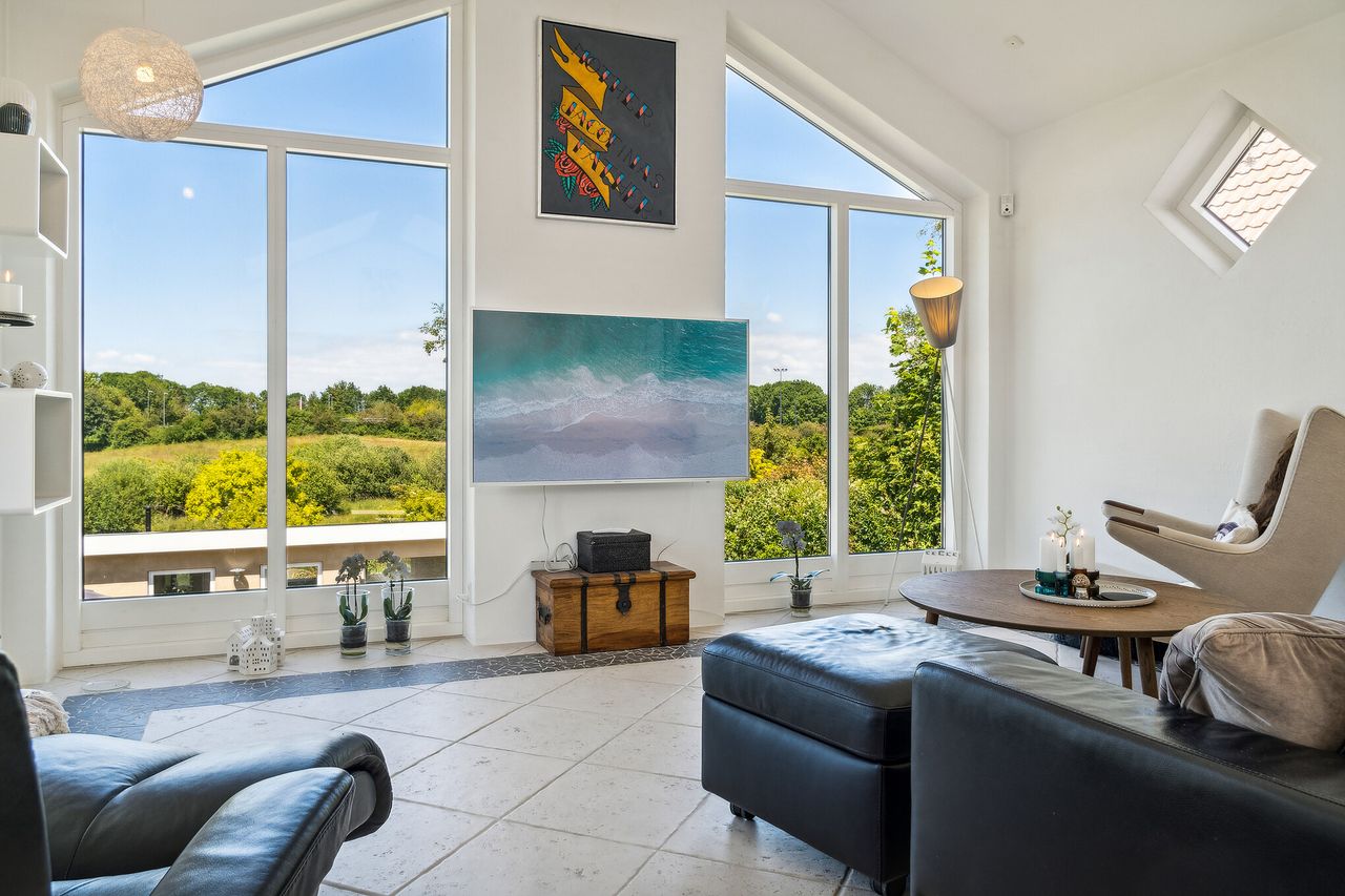 Køkkenet er hjertet i hjemmet; et lækkert rum med moderne faciliteter og en vidunderlig udsigt til de grønne marker. Her kan madlavning blive en daglig fornøjelse frem for en rutinemæssig opgave. Stuen ligger ligeledes med udsigt over markerne. Med store vinduespartier, loft til kip og flere ovenlys er det en sand fornøjelse at betragte landskabet, både sommer og vinter. Villaens stand er i top; den fremstår flot og indbydende overalt, klar til at byde sine nye ejere velkommen.
