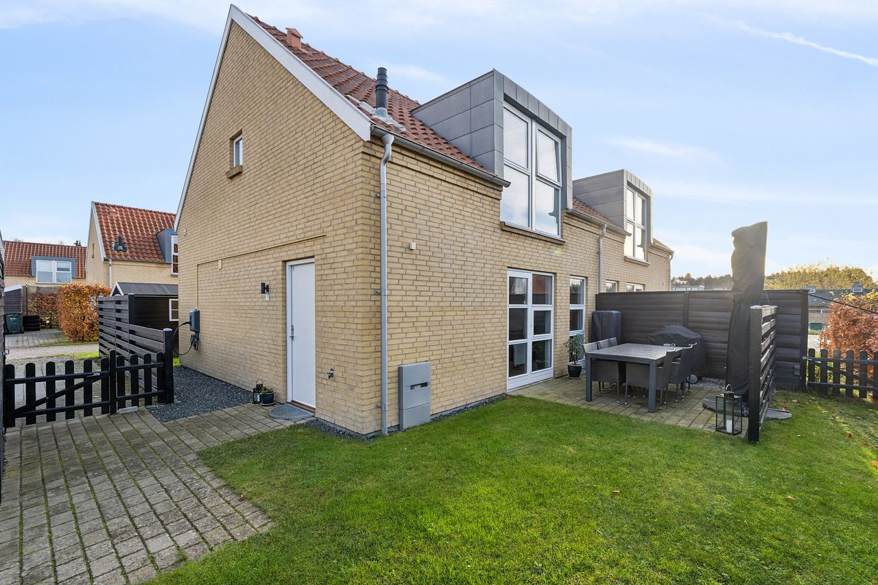 Der er have til begge sider af huset, og I kan begive jer frit mellem afsnittene udenfor takket være opbygningen som halvt dobbelthus. Der er terrasse til begge sider, så I får let ved at finde en plads i solen, og samtidig er udearealet meget let at holde. I har også en parkeringsplads.