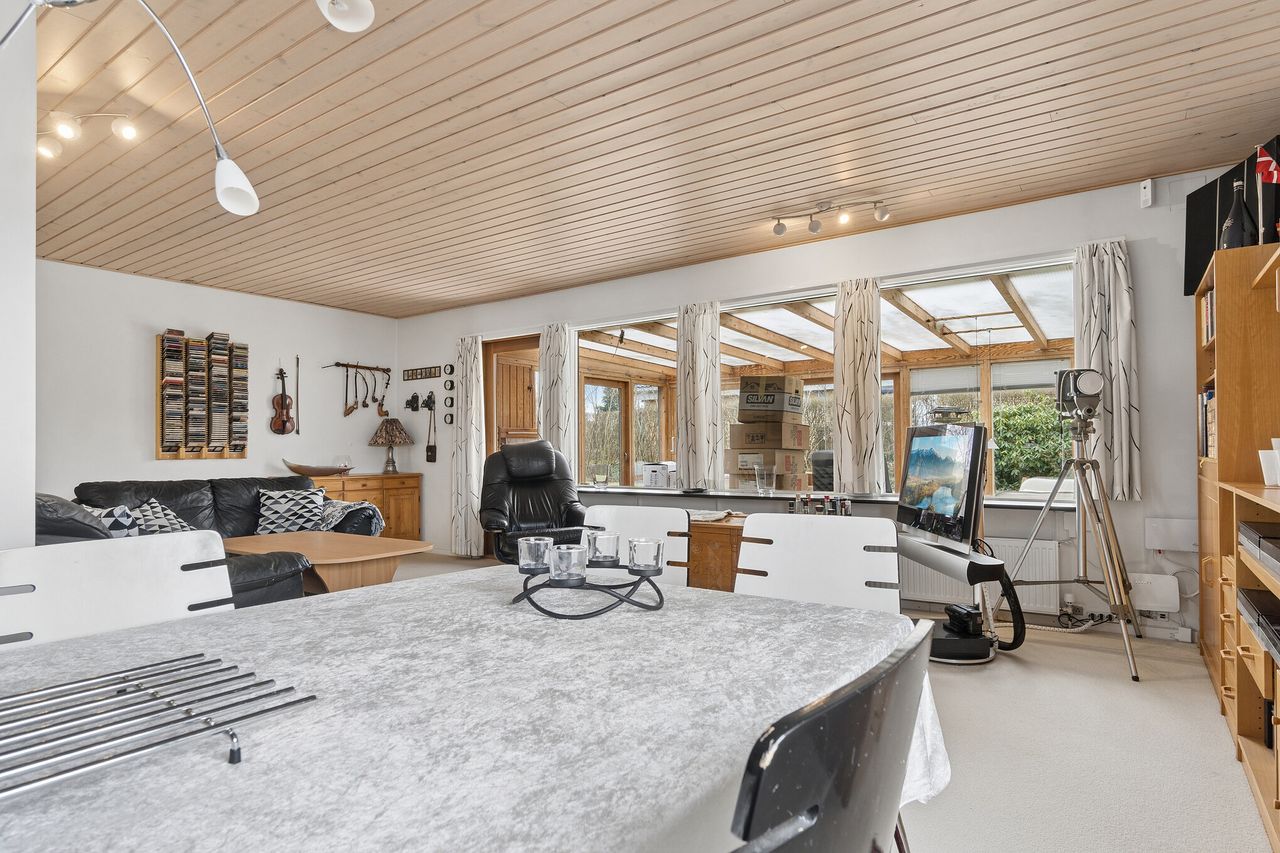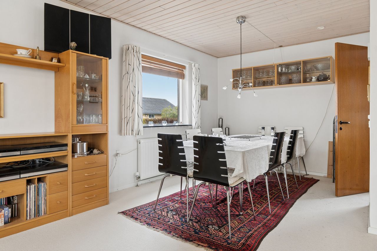 Indenfor byder boligen på en rummelig vinkelstue med god plads til både spisebord og sofaarrangement. Stuen knytter sig til en udestue med forbindelse til haven, mens køkkenet støder til stuen på modsatte side og giver rum til en ekstra spiseplads. Det er også oplagt at forene køkkenet med vinkelstuen for at skabe et åbent og moderne køkken-alrum.